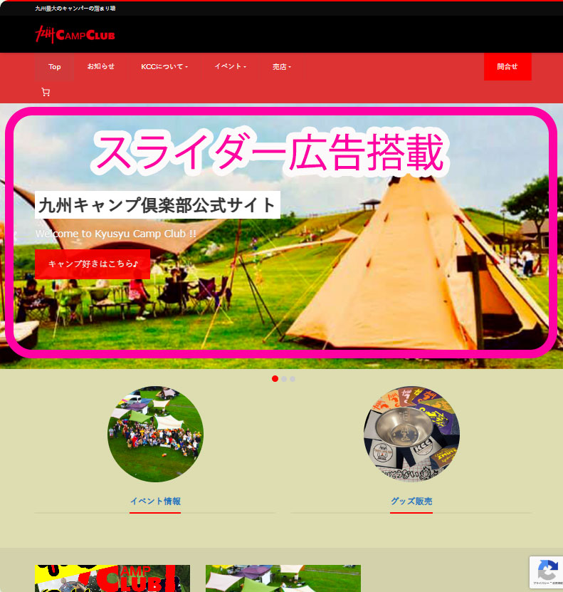 誰もが目にするTOPページ最上部の画像スライダーに貴社のサイトや製品・サービスの画像と共に指定したURLへのリンクを貼ります。